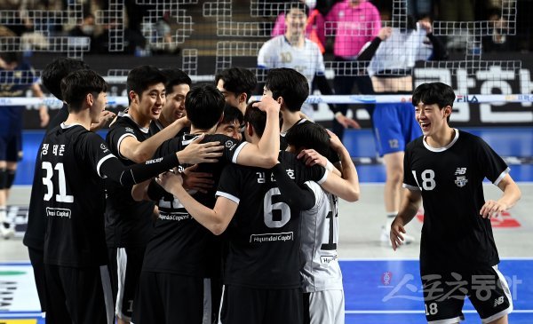 6일 충청남도 천안 유관순체육관에서 ‘2022-2023 도드람 V리그’ 천안 현대캐피탈과 서울 우리카드의 남자부 경기가 열렸다. 현대캐피탈이 우리카드를 상대로 세트스코어 3-1로 승리한 후 선수들이 코트에서 기쁨을 나누고 있다. 천안 | 김민성 기자 marineboy@donga.com