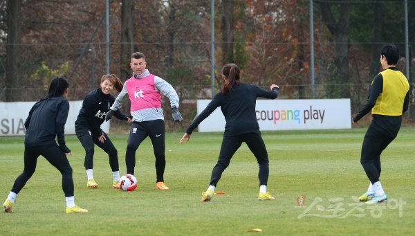 한국여자축구대표팀이 7일 경기도 파주 축구대표팀트레이닝센터(NFC)에서 뉴질랜드와 원정 평가전에 앞서 소집훈련을 진행했다. 한국 콜린 벨 감독이 선수들과 훈련하고 있다.