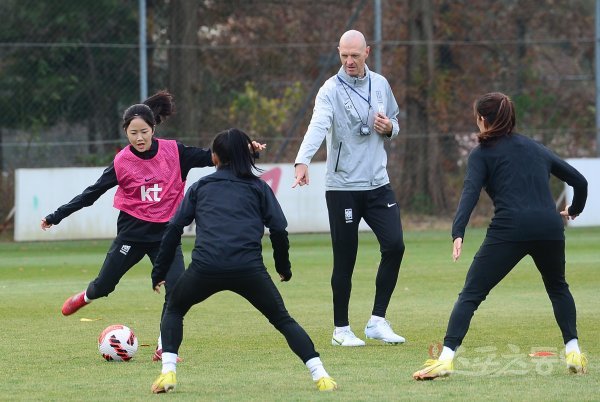 한국여자축구대표팀이 7일 경기도 파주 축구대표팀트레이닝센터(NFC)에서 뉴질랜드와 원정 평가전에 앞서 소집훈련을 진행했다. 한국 이민아(왼쪽 끝)가 패스 훈련을 하고 있다.