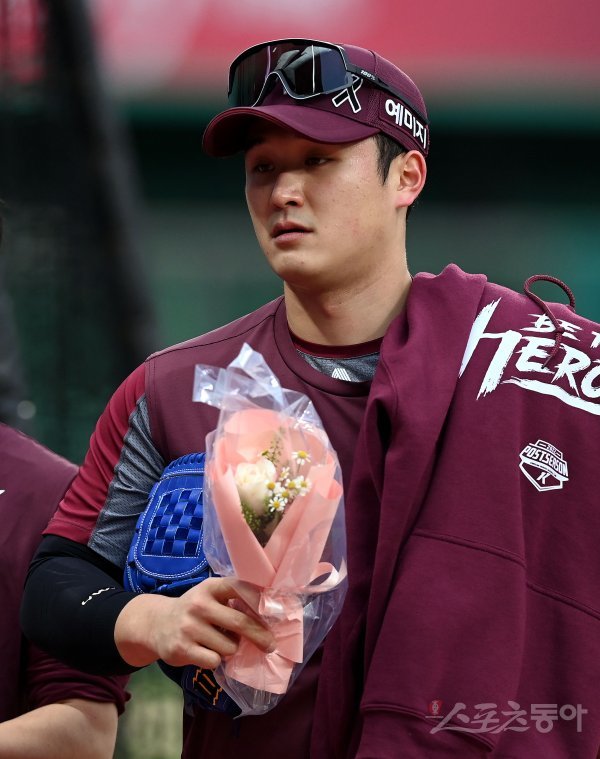 7일 인천 SSG 랜더스필드에서 ‘2022 신한은행 SOL KBO리그’ SSG 랜더스와 키움 히어로즈의 한국시리즈 3차전 경기가 열린다. 경기에 앞서 키움 최원태가 팬에게 꽃을 선물받고 있다.