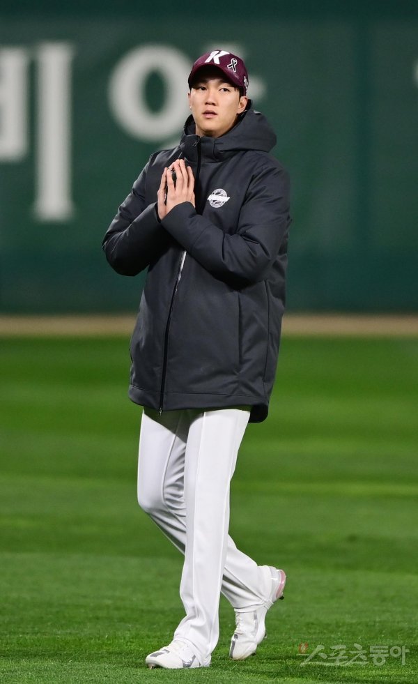 7일 인천 SSG랜더스필드에서 열린 ‘2022 신한은행 SOL KBO리그’ 한국시리즈 5차전 SSG 랜더스와 키움 히어로즈의 경기에 앞서 선발 투수 키움 안우진이 외야에서 몸을 풀고 있다.
