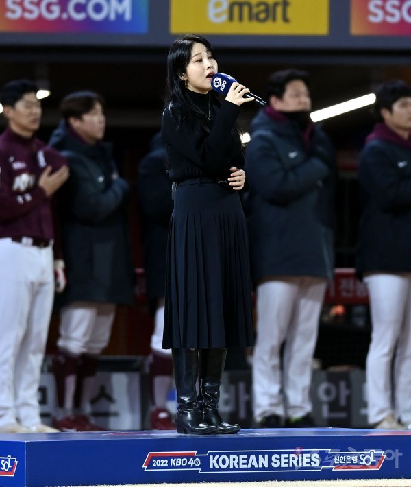 7일 인천 SSG 랜더스필드에서 ‘2022 신한은행 SOL KBO리그’ SSG 랜더스와 키움 히어로즈의 한국시리즈 5차전 경기가 열렸다. 가수 권진아가 애국가를 부르고 있다.