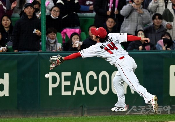 7일 인천 SSG 랜더스필드에서 ‘2022 신한은행 SOL KBO리그’ SSG 랜더스와 키움 히어로즈의 한국시리즈 5차전 경기가 열렸다. 2회초 무사 1, 2루에서 SSG 최정이 파울 타구를 잡으려고 손을 뻗었으나 놓치고 있다.