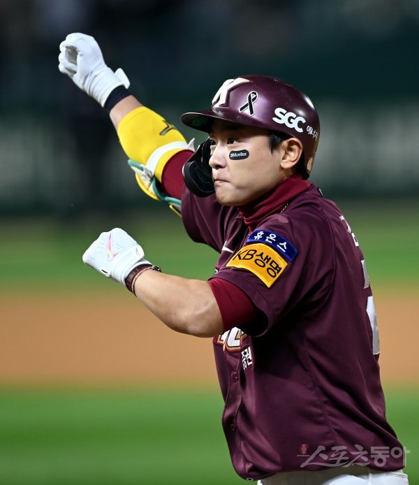 7일 인천 SSG 랜더스필드에서 ‘2022 신한은행 SOL KBO리그’ SSG 랜더스와 키움 히어로즈의 한국시리즈 5차전 경기가 열렸다. 1회초 2사 2, 3루에서 키움 김태진이 2타점 적시타를 날린 후 세리머니를 펼치고 있다.