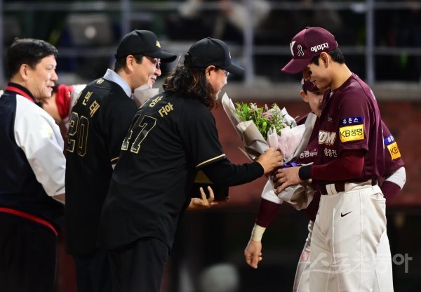 7일 인천 SSG랜더스필드에서 열린 ‘2022 신한은행 SOL KBO리그’ 한국시리즈 5차전 SSG 랜더스와 키움 히어로즈의 경기에서 레전드 40인으로 선정된 정민태, 이상훈이 키움 이정후로부터 축하 꽃다발을 받고 있다.