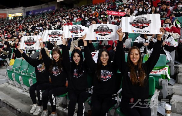 7일 인천 SSG 랜더스필드에서 ‘2022 신한은행 SOL KBO리그’ SSG 랜더스와 키움 히어로즈의 한국시리즈 5차전 경기가 열렸다. SSG 치어리더가 팬들과 함께 응원을 펼치고 있다.