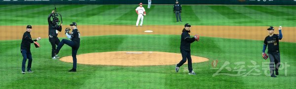 7일 인천 SSG랜더스필드에서 ‘2022 신한은행 MY CAR KBO리그’ 한국시리즈 5차전 키움 히어로즈와 SSG 랜더스 경기가 열렸다. 경기 전 KBO 레전드 40에 선정된 이상훈 MBC 스포츠플러스 해설위원,, 정민태 전 한화 이글스 코치, 구대성 전 질롱코리아 감독, 김기태 KT 위즈 퓨처스 감독이 시구를 하고 있다.