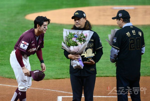 7일 인천 SSG랜더스필드에서 ‘2022 신한은행 MY CAR KBO리그’ 한국시리즈 5차전 키움 히어로즈와 SSG 랜더스 경기가 열렸다. 키움 이정후가 레전드 40 시상식을 마치고 정민태 전 한화 이글스 코치에게 인사하고 있다.
