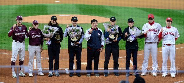 7일 인천 SSG랜더스필드에서 ‘2022 신한은행 MY CAR KBO리그’ 한국시리즈 5차전 키움 히어로즈와 SSG 랜더스 경기가 열렸다. 경기 전 KBO 레전드 40에 선정된 이상훈 MBC 스포츠플러스 해설위원,, 정민태 전 한화 이글스 코치, 구대성 전 질롱코리아 감독, 김기태 KT 위즈 퓨처스 감독이 기념촬영을 하고 있다.