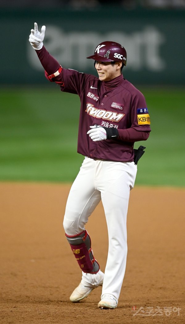 7일 인천 SSG랜더스필드에서 ‘2022 신한은행 MY CAR KBO리그’ 한국시리즈 5차전 키움 히어로즈와 SSG 랜더스 경기가 열렸다. 2회초 무사 1,2루 키움 김혜성이 중전 안타를 치고 1루에서 기뻐하고 있다.