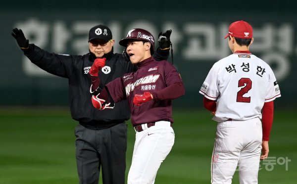 7일 인천 SSG랜더스필드에서 ‘2022 신한은행 MY CAR KBO리그’ 한국시리즈 5차전 키움 히어로즈와 SSG 랜더스 경기가 열렸다. 2회초 무사 키움 송성문이 우전 2루타를 치고 2루에서 환호하고 있다.
