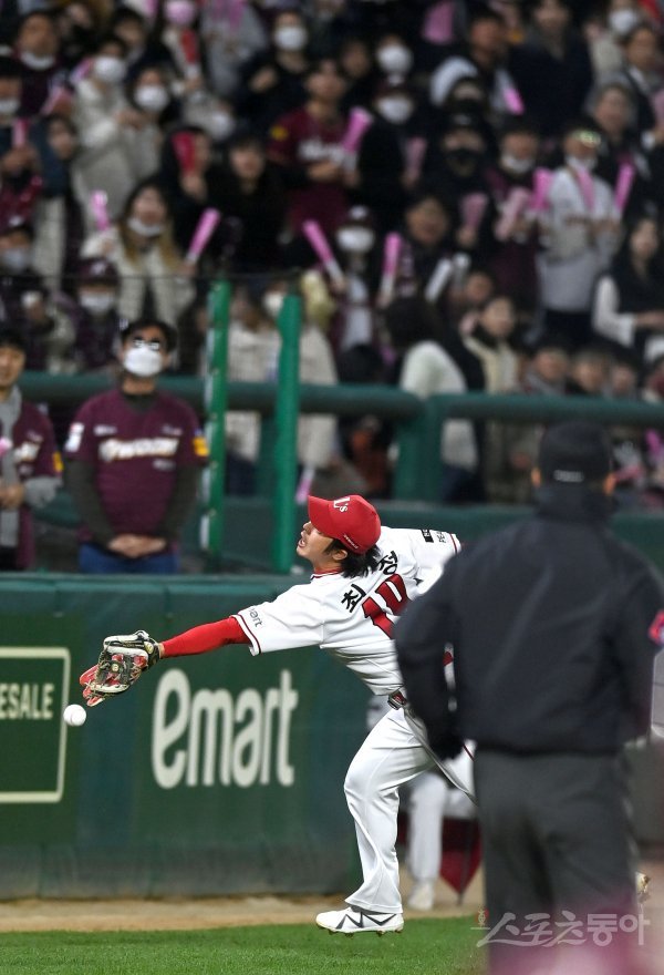 7일 인천 SSG랜더스필드에서 ‘2022 신한은행 MY CAR KBO리그’ 한국시리즈 5차전 키움 히어로즈와 SSG 랜더스 경기가 열렸다. 2회초 무사 2루 SSG 최정이 파울볼을 놓치고 있다.
