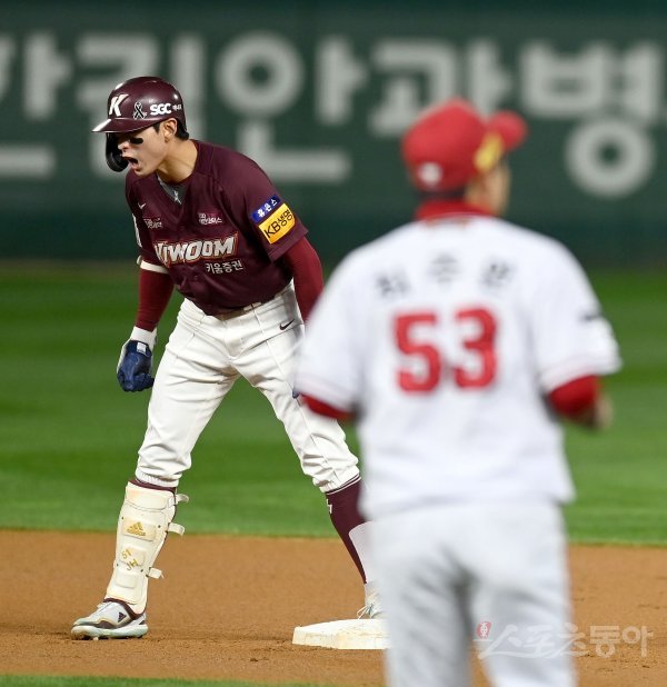 7일 인천 SSG랜더스필드에서 ‘2022 신한은행 MY CAR KBO리그’ 한국시리즈 5차전 키움 히어로즈와 SSG 랜더스 경기가 열렸다. 1회초 1사 1루 키움 이정후가 우전 2루타를 치고 2루에서 환호하고 있다.