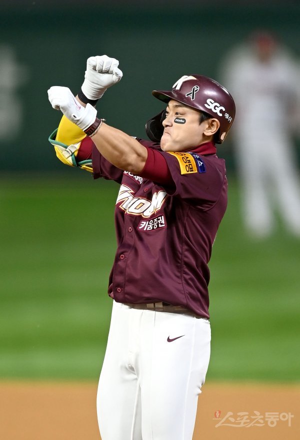 7일 인천 SSG랜더스필드에서 ‘2022 신한은행 MY CAR KBO리그’ 한국시리즈 5차전 키움 히어로즈와 SSG 랜더스 경기가 열렸다. 1회초 2사 2,3루 키움 김태진이 선제 2타점 적시타를 치고 1루에서 환호하고 있다.