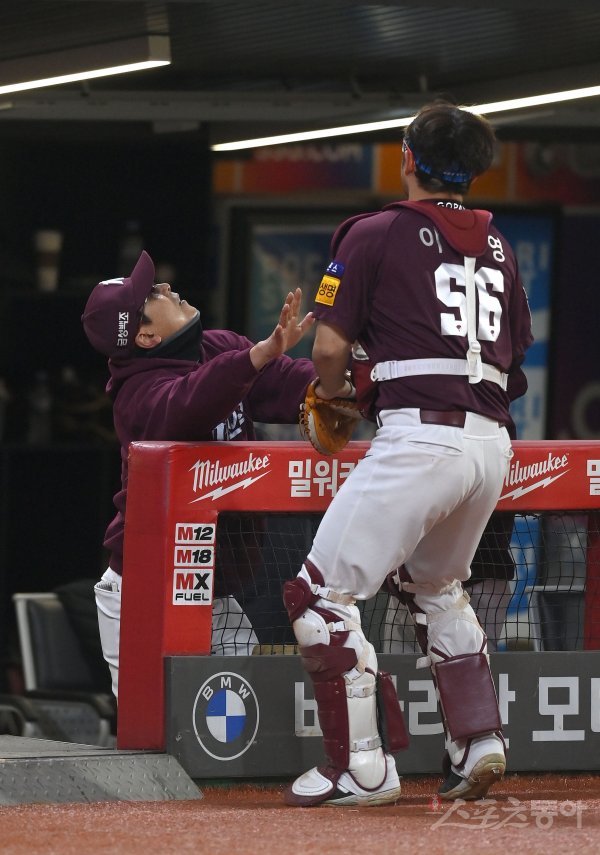 7일 인천 SSG랜더스필드에서 ‘2022 신한은행 MY CAR KBO리그’ 한국시리즈 5차전 키움 히어로즈와 SSG 랜더스 경기가 열렸다. 4회말 키움 이지영이 파울볼을 잡기 위해 더그아웃으로 달려오자 홍원기 감독이 말리고 있다.