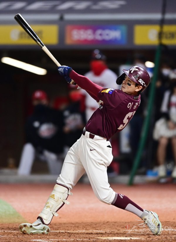 7일 인천 SSG랜더스필드에서 열린 ‘2022 신한은행 SOL KBO리그’ 한국시리즈 5차전 SSG 랜더스와 키움 히어로즈의 경기에서 5회초 1사 키움 이정후가 좌전 2루타를 치고 있다.