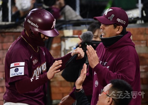 7일 인천 SSG랜더스필드에서 열린 ‘2022 신한은행 SOL KBO리그’ 한국시리즈 5차전 SSG 랜더스와 키움 히어로즈의 경기에서 6회초 1사 2루 키움의 우전 적시타 때 득점에 성공한 2루주자 송성문이 홍원기 감독의 축하를 받고 있다.