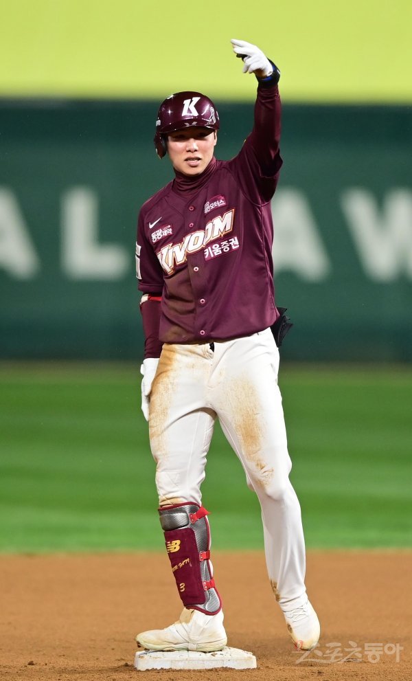 7일 인천 SSG랜더스필드에서 열린 ‘2022 신한은행 SOL KBO리그’ 한국시리즈 5차전 SSG 랜더스와 키움 히어로즈의 경기에서 6회초 1사 2루 키움 김혜성이 1타점 우전 적시타를 친 후 세리머니하고 있다.