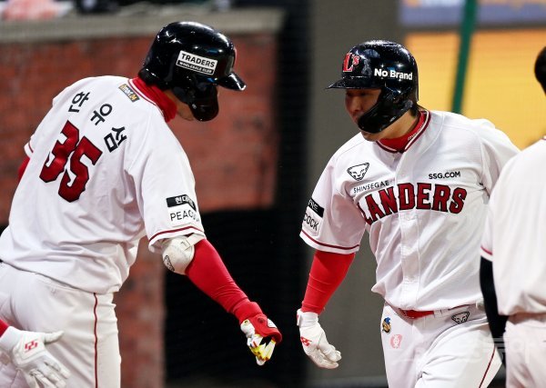 7일 인천 SSG 랜더스필드에서 ‘2022 신한은행 SOL KBO리그’ SSG 랜더스와 키움 히어로즈의 한국시리즈 5차전 경기가 열렸다. 8회말 1사 1루에서 SSG 최정이 투런 홈런을 쏘아 올린 후 동료와 기쁨을 나누고 있다.