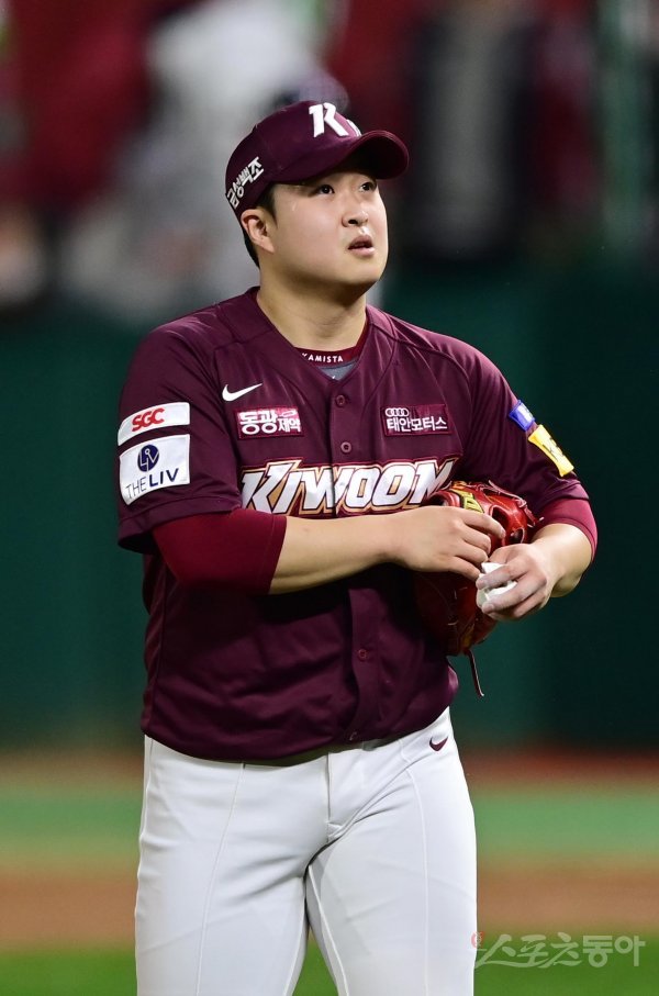 7일 인천 SSG랜더스필드에서 열린 ‘2022 신한은행 SOL KBO리그’ 한국시리즈 5차전 SSG 랜더스와 키움 히어로즈의 경기에서 8회말 1사 1루 SSG에 투런 홈런을 허용한 키움 김재웅이 아쉬워하고 있다.