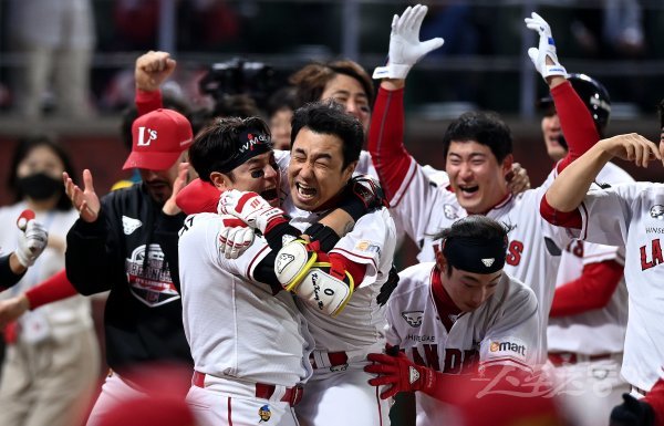 7일 인천 SSG 랜더스필드에서 ‘2022 신한은행 SOL KBO리그’ SSG 랜더스와 키움 히어로즈의 한국시리즈 5차전 경기가 열렸다. 9회말 무사 1, 2루에서 SSG 김강민이 끝내기 스리런 홈런을 날린 후 동료들과 기쁨을 나누고 있다.