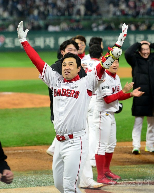 7일 인천 SSG랜더스필드에서 ‘2022 신한은행 MY CAR KBO리그’ 한국시리즈 5차전 키움 히어로즈와 SSG 랜더스 경기가 열렸다. 9회말 1사 1,3루 SSG 김강민이 끝내기 스리런 홈런을 날리고 그라운들 돌아 홈인해 환호하고 있다.
