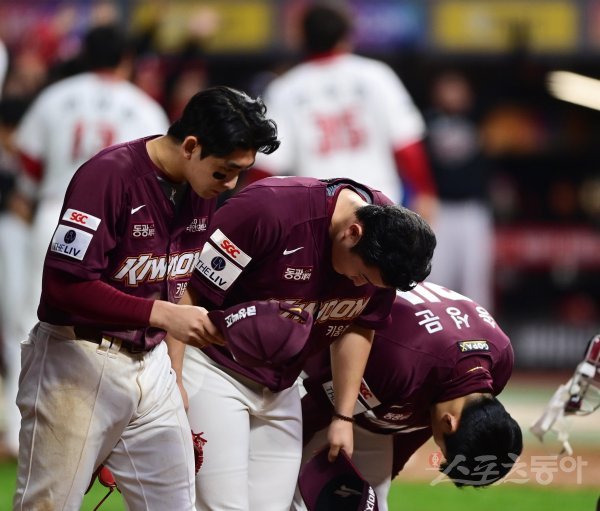 7일 인천 SSG랜더스필드에서 열린 ‘2022 신한은행 SOL KBO리그’ 한국시리즈 5차전 SSG 랜더스와 키움 히어로즈의 경기에서 9회말 무사 1, 3루 SSG 김강민이 역전 끝내기 좌월 3점 홈런을 허용해 4-5로 패한 키움 이정후, 최원태가 팬들에게 인사하고 있다.