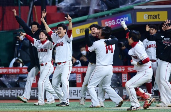 7일 인천 SSG랜더스필드에서 열린 ‘2022 신한은행 SOL KBO리그’ 한국시리즈 5차전 SSG 랜더스와 키움 히어로즈의 경기에서 9회말 무사 1, 3루 SSG 김강민이 역전 끝내기 좌월 3점 홈런을 친 후 동료들이 더그아웃을 뛰어나오고 있다.