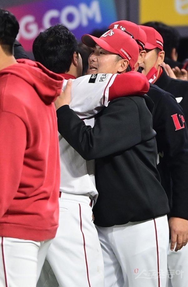 7일 인천 SSG랜더스필드에서 열린 ‘2022 신한은행 SOL KBO리그’ 한국시리즈 5차전 SSG 랜더스와 키움 히어로즈의 경기에서 9회말 무사 1, 3루 SSG 김강민이 역전 끝내기 좌월 3점 홈런을 친 후 김원형 감독의 축하를 받고 있다.