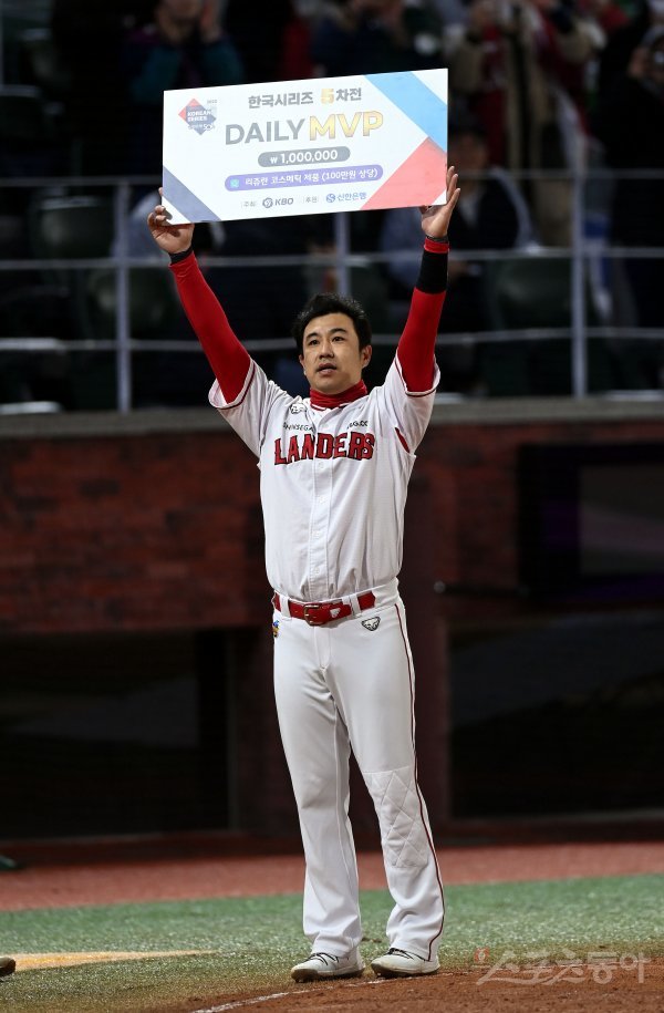 7일 인천 SSG 랜더스필드에서 ‘2022 신한은행 SOL KBO리그’ SSG 랜더스와 키움 히어로즈의 한국시리즈 5차전 경기가 열렸다. 9회말 무사 1, 2루에서 SSG 김강민이 끝내기 스리런 홈런으로 승리한 후 데일리 MVP에 선정되어 기념촬영을 하고 있다.