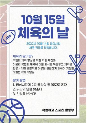 《학교체육진흥회와 스포츠동아는 학교체육 활성화를 위해 ‘2022 학생 스포츠기자단’을 운영합니다. 중·고등학생을 대상으로 공모를 통해 선발된 학생 스포츠기자단은 다양한 학교 스포츠 활동 및 일반 스포츠 관련 소식을 취재해 소개합니다. 이를 통해 학생들의 스포츠 활동에 대한 관심을 높이고, 건강하고 활기찬 학교체육 문화조성에 앞장설 것입니다.》옥련여고 19대 스포츠 활동부 학생들은 최근 SNS 스트레칭 이벤트를 열었다. 10월 15일 체육의 날을 기념하여 하루 전 학생들에게 스포츠 관련 퀴즈를 내어 맞히는 사람에게 간식을 증정하는 이벤트였다. 스포츠 활동부는 어떤 점을 중요시하는지 옥련여고 스포츠 활동부 부장에게 물었다.