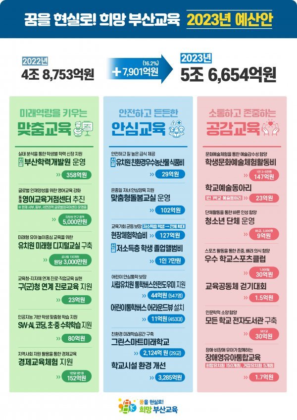 부산시교육청이 올해보다 7901억원(16.2%)이 증가한 5조 6654억원 규모의 ‘내년 부산시교육비특별회계 예산안’을 편성해 부산시의회에 제출했다고 8일 밝혔다. 학력신장, 디지털·진로교육, 안전한 학교 조성에 집중 편성