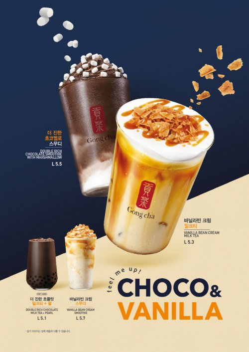 기분 전환이 필요한 고객을 위한 ‘FEEL ME UP!’을 콘셉트로 ‘바닐라빈 크림 밀크티’, ‘바닐라빈 크림 스무디’, ‘더 진한 초콜릿 밀크티+펄’, ‘더 진한 초코멜로 스무디’ 등으로 구성했다. 바닐라빈과 카라멜의 깊은 풍미, 더욱 진하고 깊은 맛의 초콜릿, 이 모든 맛을 배가 시켜주는 다양한 토핑으로 부드러운 향과 달콤한 맛이 인상적이다.