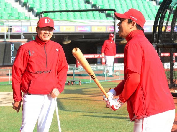 8일 인천 SSG랜더스필드에서 열린 ‘2022 신한은행 SOL KBO리그’ 한국시리즈 6차전 SSG 랜더스와 키움 히어로즈의 경기에 앞서 SSG 김원형 감독이 김강민과 이야기하고 있다.