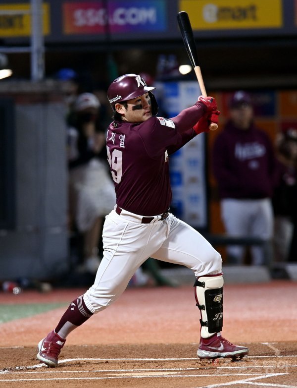 8일 인천 SSG 랜더스필드에서 ‘2022 신한은행 SOL KBO리그’ SSG 랜더스와 키움 히어로즈의 한국시리즈 6차전 경기가 열렸다. 1회초 무사에서 키움 임지열이 안타를 날리고 있다.