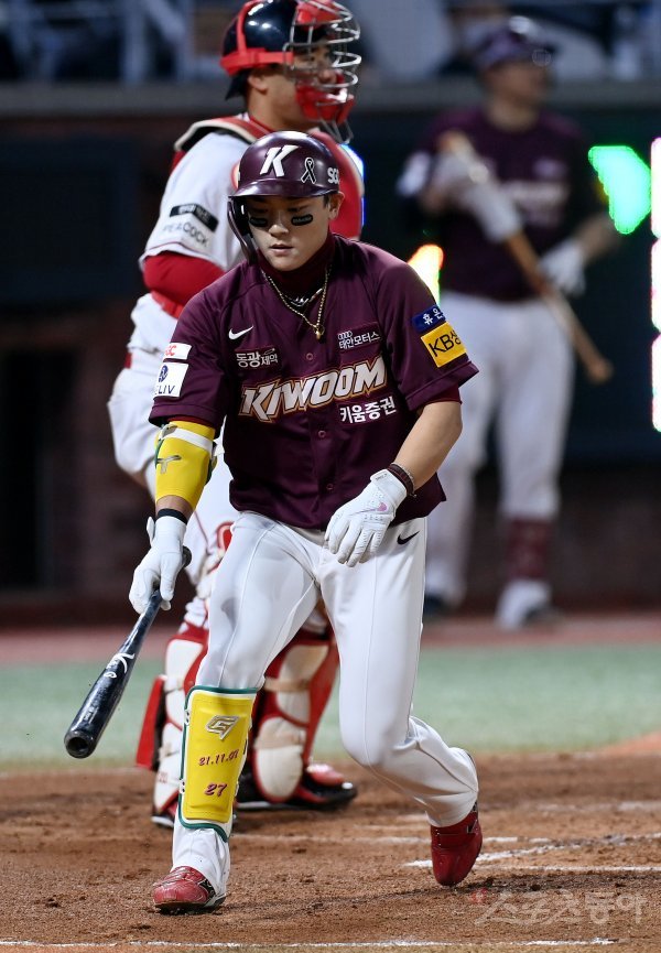 8일 인천 SSG 랜더스필드에서 ‘2022 신한은행 SOL KBO리그’ SSG 랜더스와 키움 히어로즈의 한국시리즈 6차전 경기가 열렸다. 2회초 무사에서 키움 김태진이 13구 끝에 볼넷으로 출루하고 있다.