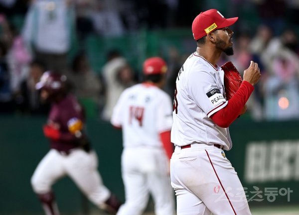 8일 인천 SSG 랜더스필드에서 ‘2022 신한은행 SOL KBO리그’ SSG 랜더스와 키움 히어로즈의 한국시리즈 6차전 경기가 열렸다. 3회초 1사 1루에서 투런 홈런을 허용한 SSG 선발 폰트가 아쉬워하고 있다.