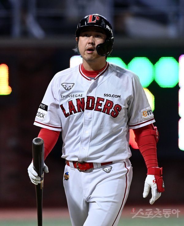8일 인천 SSG 랜더스필드에서 ‘2022 신한은행 SOL KBO리그’ SSG 랜더스와 키움 히어로즈의 한국시리즈 6차전 경기가 열렸다. 1회말 2사에서 SSG 최정이 삼진 아웃으로 물러나고 있다.