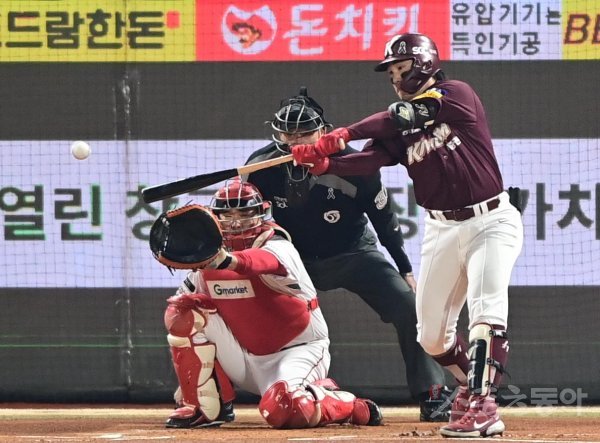 8일 인천 SSG랜더스필드에서 열린 ‘2022 신한은행 SOL KBO리그’ 한국시리즈 6차전 SSG 랜더스와 키움 히어로즈의 경기에서 1회초 무사 키움 임지열이 우전 안타를 치고 있다.