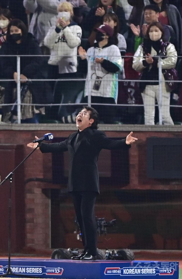 8일 인천 SSG랜더스필드에서 열린 ‘2022 신한은행 SOL KBO리그’ 한국시리즈 6차전 SSG 랜더스와 키움 히어로즈의 경기에 앞서 고성현 교수가 애국가를 제창하고 있다.