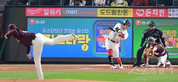 8일 인천 SSG랜더스필드에서 열린 ‘2022 신한은행 SOL KBO리그’ 한국시리즈 6차전 SSG 랜더스와 키움 히어로즈의 경기에서 1회말 무사 SSG 추신수가 헛스윙 삼진을 당하고 있다.
