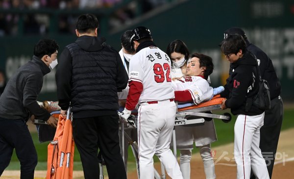 8일 인천 SSG랜더스필드에서 ‘2022 신한은행 MY CAR KBO리그’ 한국시리즈 6차전 키움 히어로즈와 SSG 랜더스 경기가 열렸다. 3회말 1사 SSG 내야 땅볼 때 키움 실책하는 사이 1루주자 한유섬이 3루로 달리다 부상을 당해 들것에 실려나가고 있다.