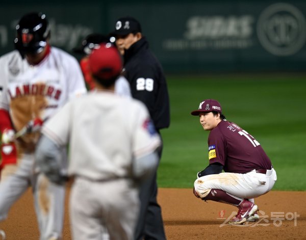 8일 인천 SSG랜더스필드에서 ‘2022 신한은행 MY CAR KBO리그’ 한국시리즈 6차전 키움 히어로즈와 SSG 랜더스 경기가 열렸다. 3회말 2사 2,3루 SSG 한유섬 1루수 앞 땅볼 때 키움 전병우가 송구 실책을 범한 후 아 있다.