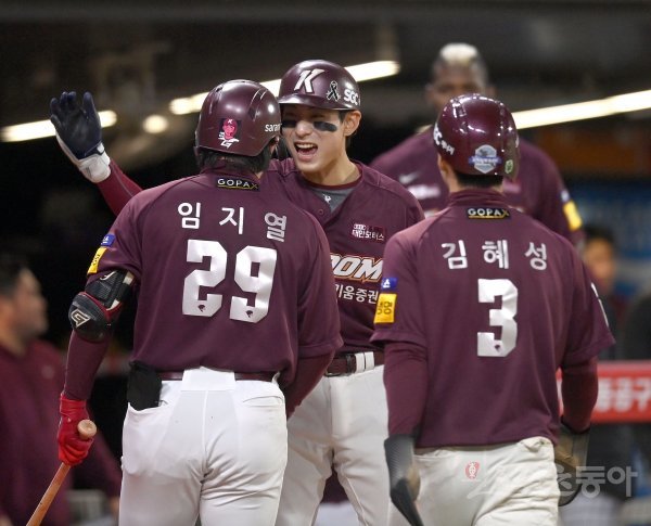8일 인천 SSG랜더스필드에서 ‘2022 신한은행 MY CAR KBO리그’ 한국시리즈 6차전 키움 히어로즈와 SSG 랜더스 경기가 열렸다. 3회초 무사 1루 키움 임지열이 선제 우월 투런 홈런을 날리고 그라운드를 돌아 홈인해 이정후와 하이파이브 하고 있다.
