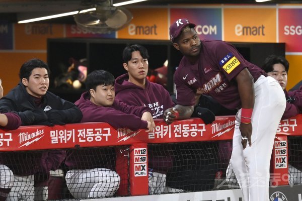 8일 인천 SSG랜더스필드에서 ‘2022 신한은행 MY CAR KBO리그’ 한국시리즈 6차전 키움 히어로즈와 SSG 랜더스 경기가 열렸다. 경기 전 키움 김혜성, 김재웅, 안우진, 푸이그가 그라운드를 바라보고 있다.