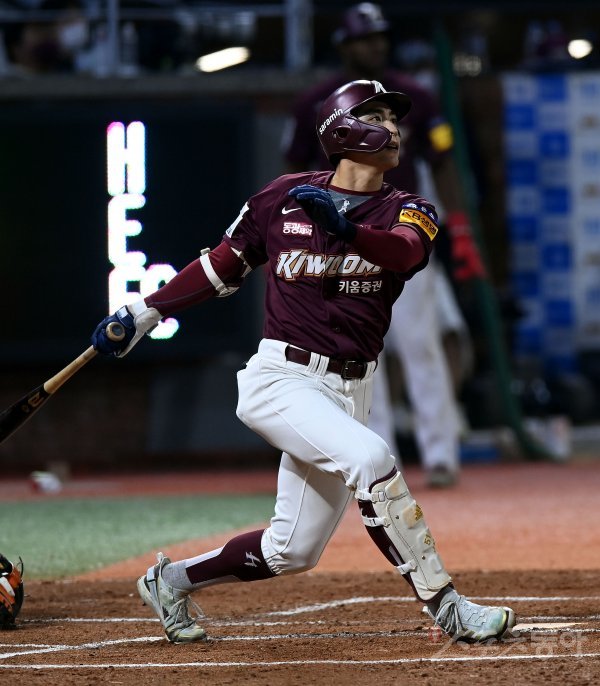8일 인천 SSG 랜더스필드에서 ‘2022 신한은행 SOL KBO리그’ SSG 랜더스와 키움 히어로즈의 한국시리즈 6차전 경기가 열렸다. 6회초 1사에서 키움 이정후가 솔로 홈런을 쏘아 올리고 있다.