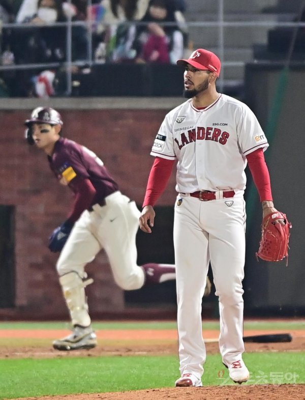 8일 인천 SSG랜더스필드에서 열린 ‘2022 신한은행 SOL KBO리그’ 한국시리즈 6차전 SSG 랜더스와 키움 히어로즈의 경기에서 6회초 1사 키움 이정후에 솔로포를 허용한 SSG 폰트가 타구를 바라보고 있다.