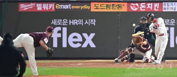 8일 인천 SSG랜더스필드에서 열린 ‘2022 신한은행 SOL KBO리그’ 한국시리즈 6차전 SSG 랜더스와 키움 히어로즈의 경기에서 6회말 1사 2, 3루 SSG 김성현이 역전 2타점 좌전 2루타를 치고 있다.