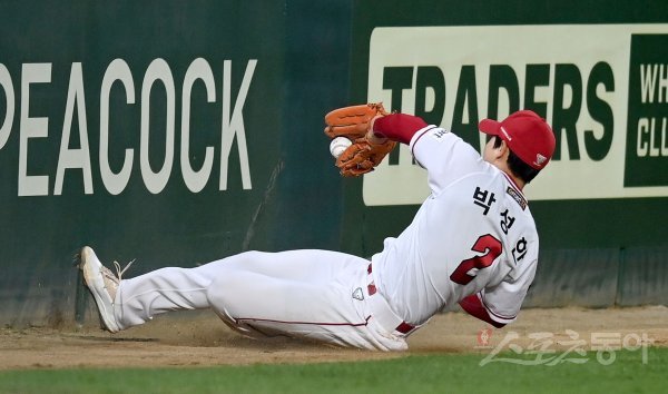 8일 인천 SSG랜더스필드에서 ‘2022 신한은행 MY CAR KBO리그’ 한국시리즈 6차전 키움 히어로즈와 SSG 랜더스 경기가 열렸다. 7회초 1사 SSG 박성한이 파울볼을 잡고 있다.