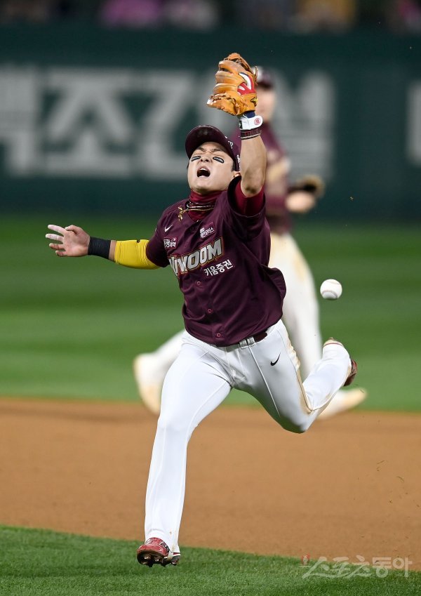 8일 인천 SSG랜더스필드에서 ‘2022 신한은행 MY CAR KBO리그’ 한국시리즈 6차전 키움 히어로즈와 SSG 랜더스 경기가 열렸다. 6회말 무사 키움 김태진이 SSG 라가레스의 타구를 포구 실책하고 있다.